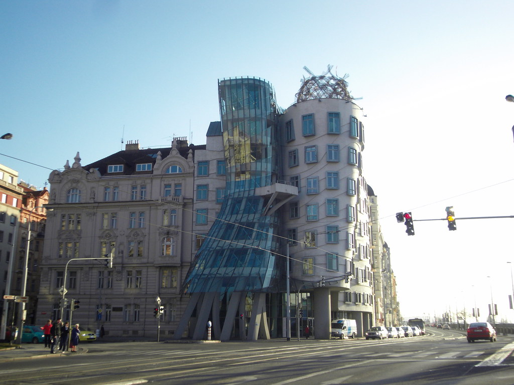 Construida con una estructura mixta de hormigón y acero, la Casa Danzante desafía las reglas de la arquitectura convencional. Las ventanas parecen colocadas de manera irregular, creando un efecto dinámico que refuerza la ilusión de movimiento. El juego de curvas, líneas inclinadas y superficies ondulantes da la sensación de que el edificio está vivo, como si realmente se balanceara con gracia sobre la ribera del Moldava.