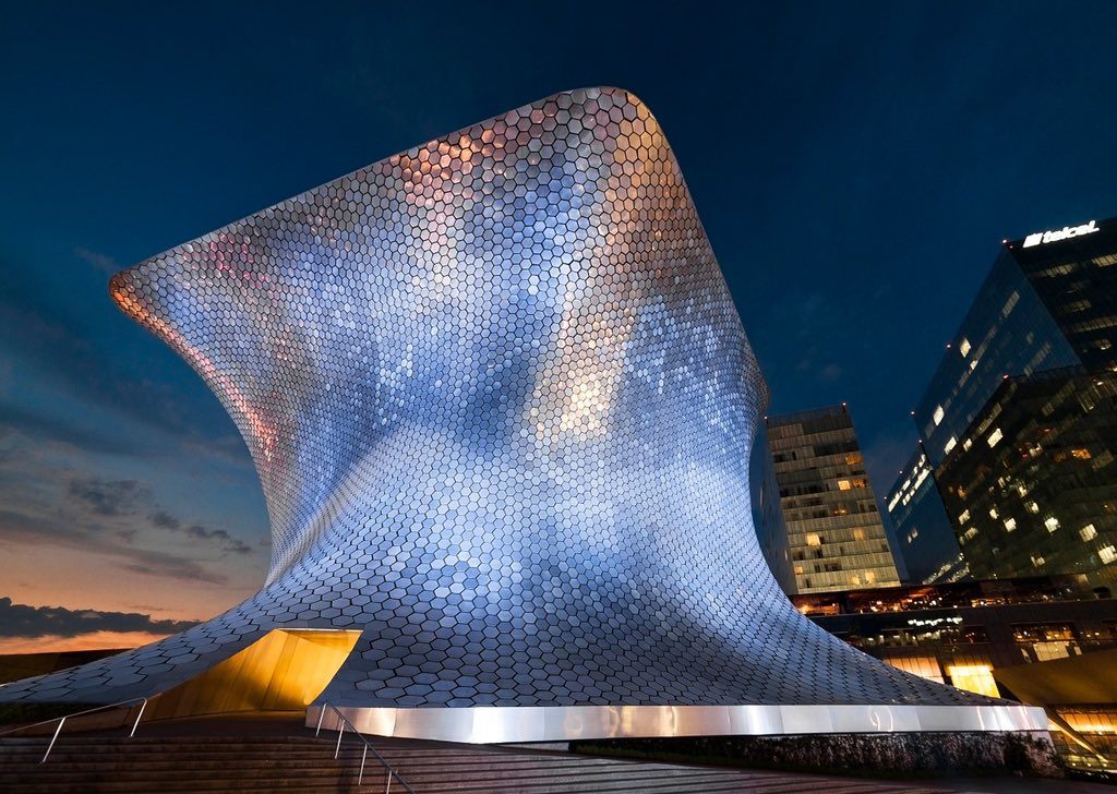 Diseñado por el arquitecto mexicano Fernando Romero —y con la colaboración estructural de la firma Ove Arup— el Museo Soumaya se ha convertido en uno de los edificios más fotografiados de la Ciudad de México. Su forma asimétrica y sinuosa, recubierta por más de 16 mil hexágonos de aluminio brillante, se inspira en parte en la geometría orgánica y en parte en la estética de una escultura monumental. De día, el edificio refleja el cielo y sus alrededores; de noche, parece flotar como una nave futurista.