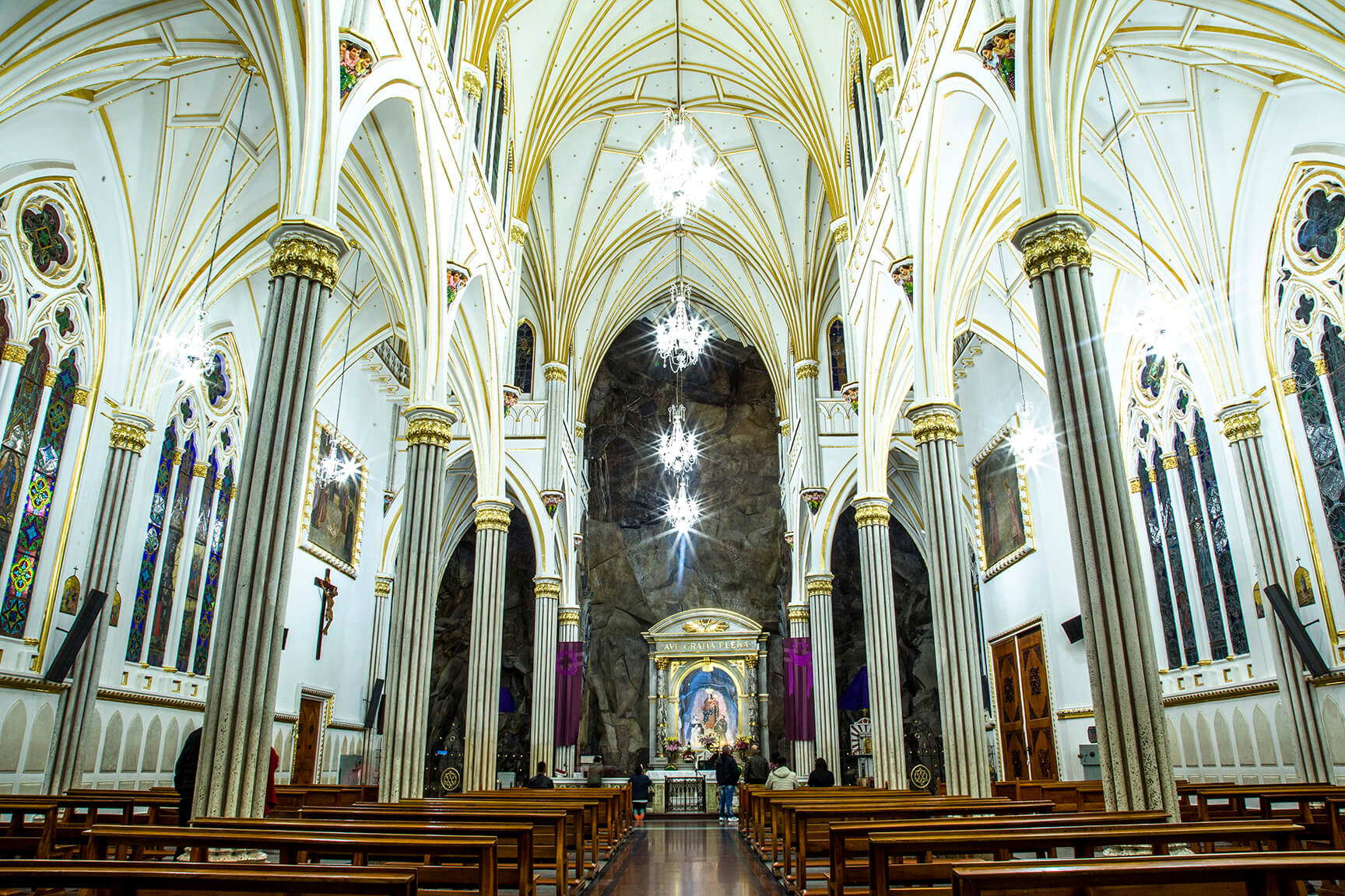 El Santuario de Las Lajas es un claro exponente del estilo neogótico, caracterizado por sus arcos apuntados, bóvedas de crucería y vitrales coloridos que filtran la luz creando un ambiente único en su interior. Lo que lo hace verdaderamente singular es su integración con el entorno: construido en piedra gris y blanca, el templo parece emerger directamente de las rocas del cañón, suspendido sobre el río Guáitara a una altura de 50 metros.
