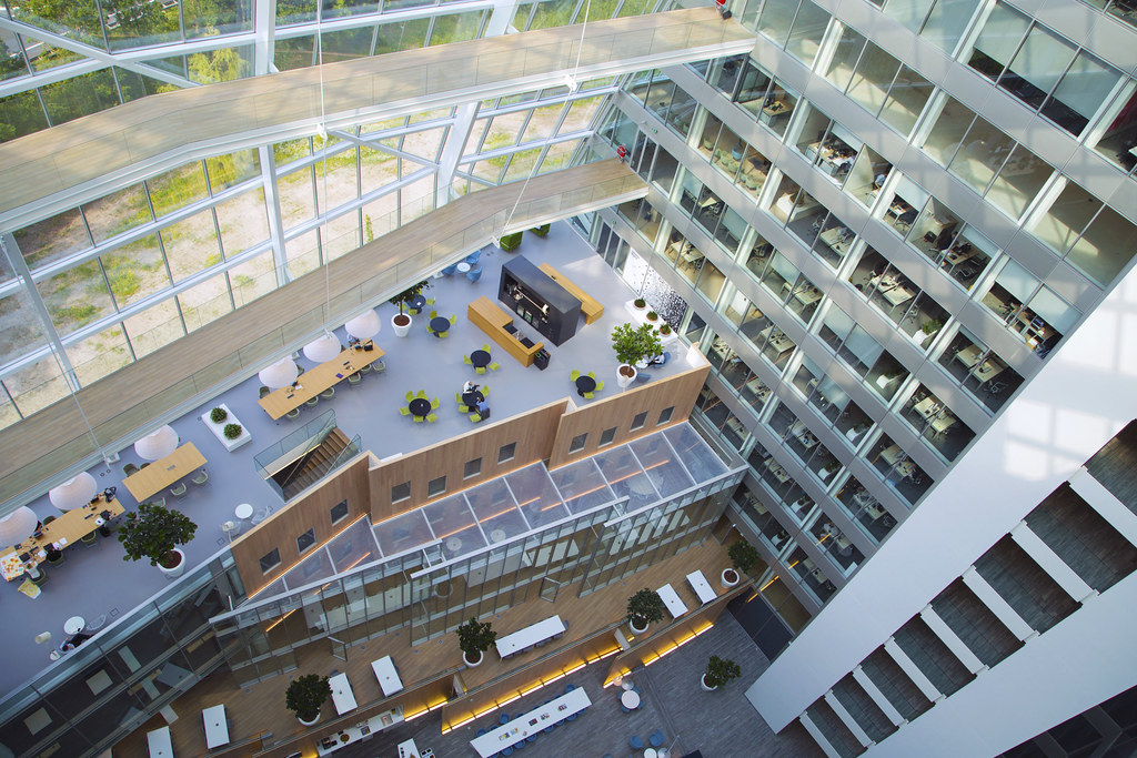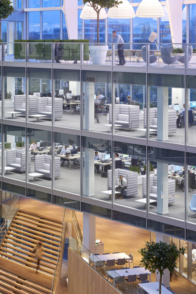 Visualmente, The Edge impresiona con su atrio central de varios pisos que funciona como el corazón del edificio. Este gran espacio de circulación vertical está inundado por luz natural gracias a su fachada de vidrio, que no solo embellece el entorno, sino que reduce el consumo energético al aprovechar al máximo la iluminación solar. El diseño arquitectónico permite la conectividad entre todos los niveles, fomentando una cultura abierta y colaborativa.